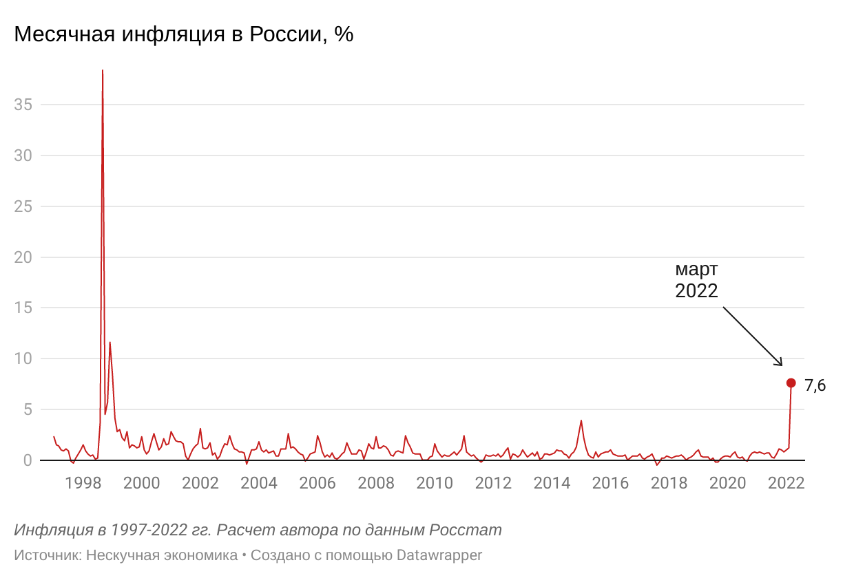 В начале 2022 года на фоне известных событий месячная инфляция в России в марте 2022 года (к февралю 2022 г.) составила 7,6%. Этот стало рекордным месячным увеличением цен с января 1999 года, когда месячная инфляция была на уровне 8,4%.